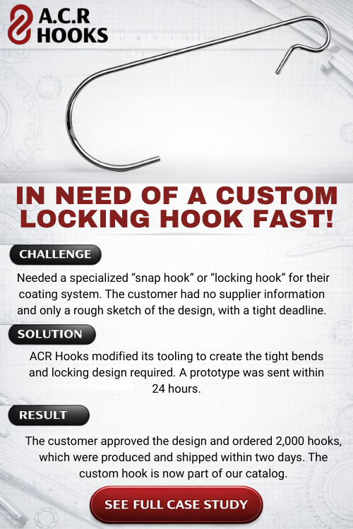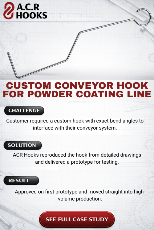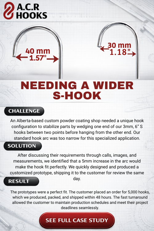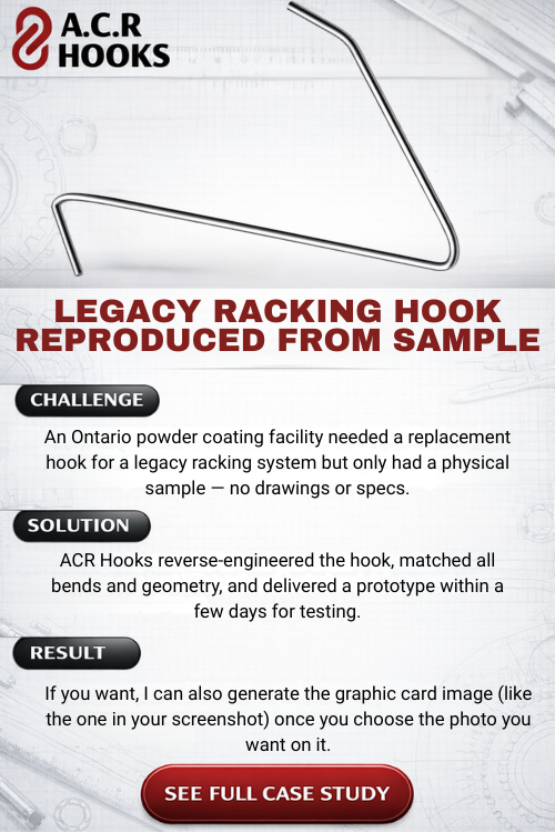 At ACR Hooks, we’re proud to support the powder coating and coating industries with high-quality, Canadian-made solutions. Our customer Success stories below highlight our dedication to fast turnaround times, custom solutions, and exceptional quality.